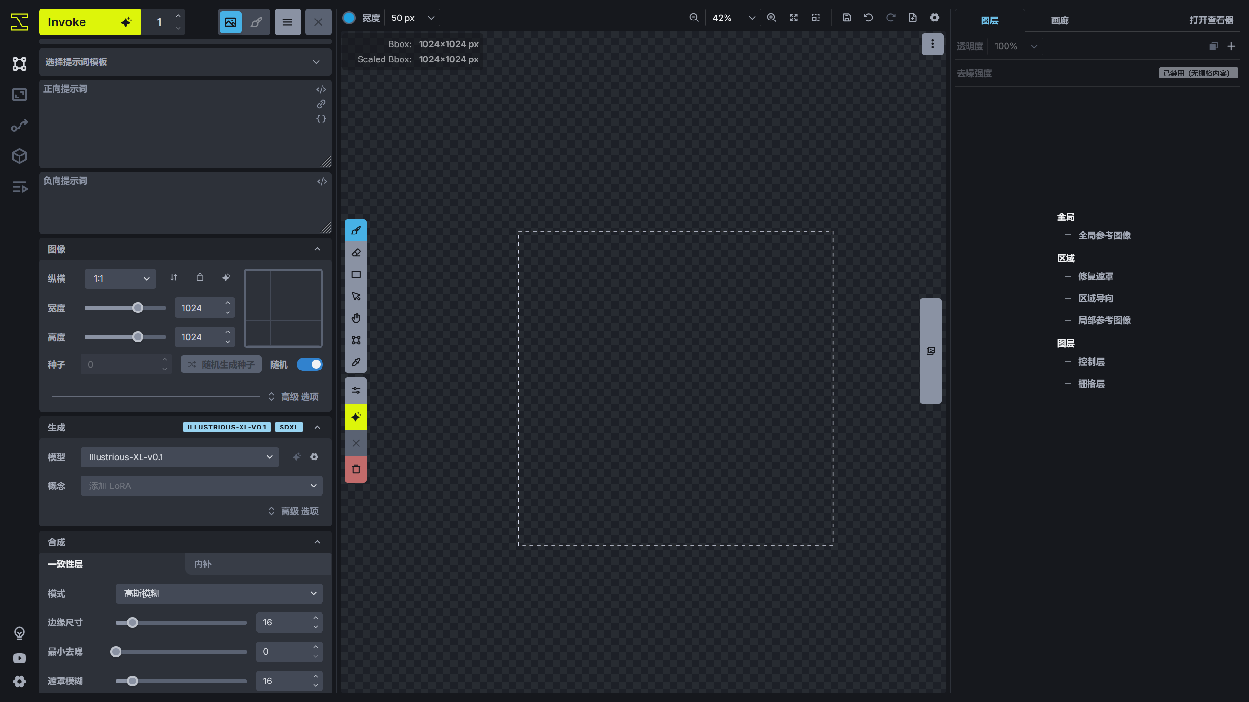 InvokeAI 的核心功能,也是 InvokeAI 最有特色的功能。统一画布将文生图、图生图、画布,ControlNet、IP Adapter、分区提示词结合起来,使创作变得简单。