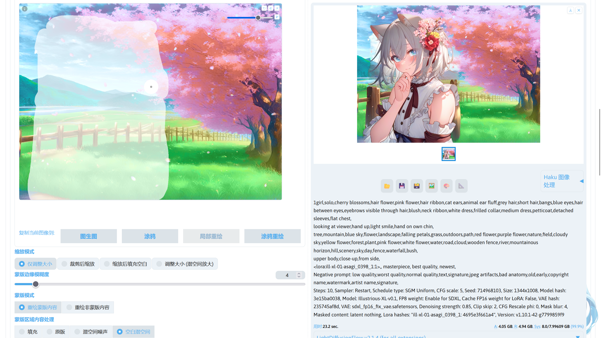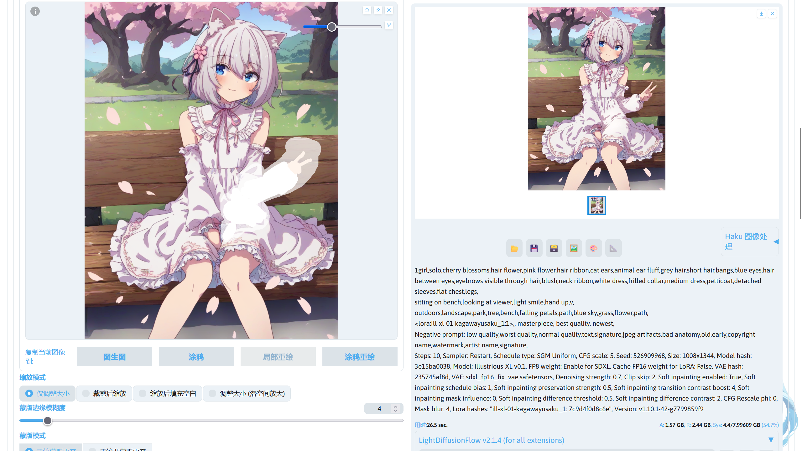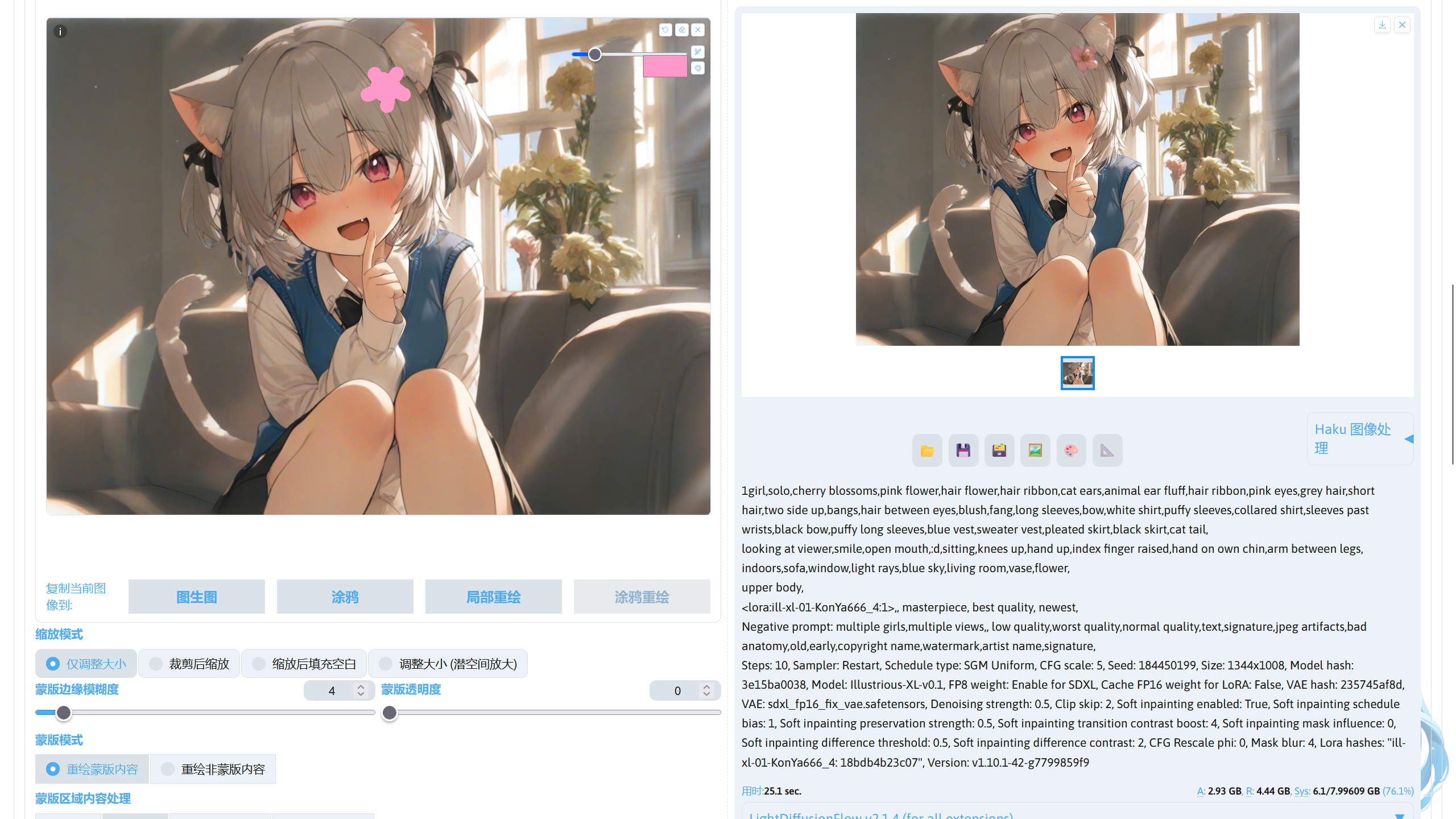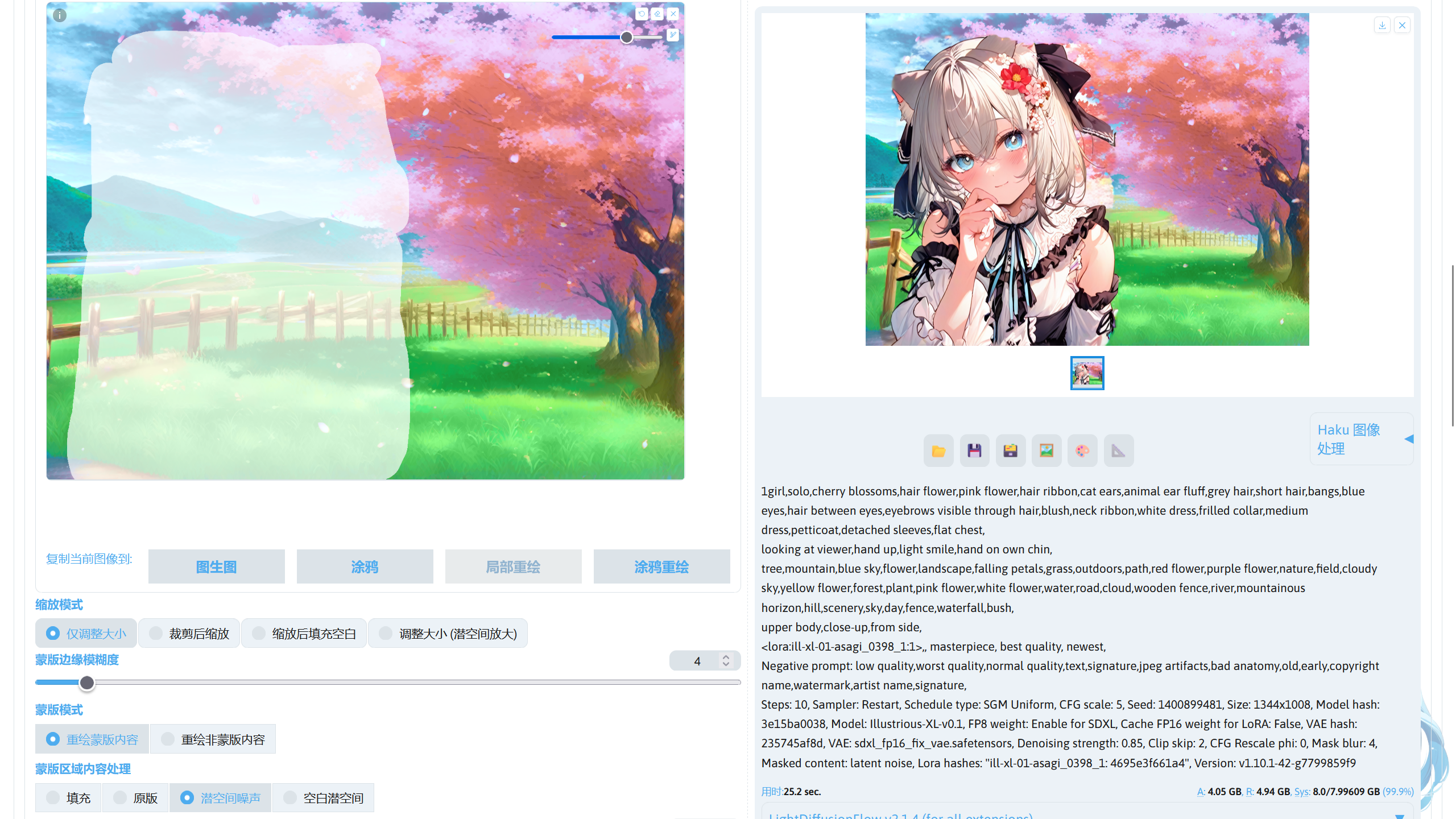 图生图需要将原图反推为潜空间数据,因此占用会比文生图更高,并且参考图尺寸越大占用越高。对于局部重绘,占用会比单纯图生图再略高,但这并不意味着低显存就不能局部重绘,实际上只要采用将重绘区域裁剪下来的方法就可以实现低显存重绘。并且由于图生图会经过两次 VAE,在使用 VAE 异常的模型时,每次重绘都会导致画面变得更灰,反复迭代将灰到不能看,最好保持外挂 VAE。