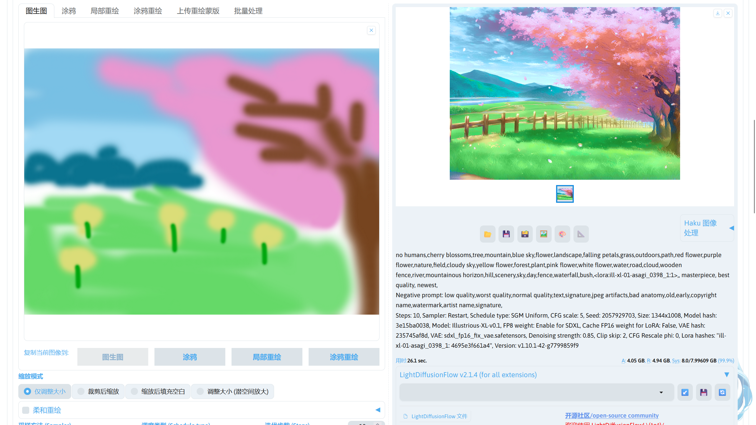 因为需要将涂鸦转换为一张壁纸,需要对涂鸦做大改动,所以重绘幅度设置为比较高的值,如 0.85,设置完后进行一次图生图。