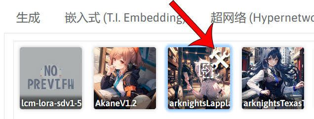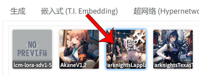 如果你需要使用某个 LoRA 模型时,点击 LoRA 模型的卡片。