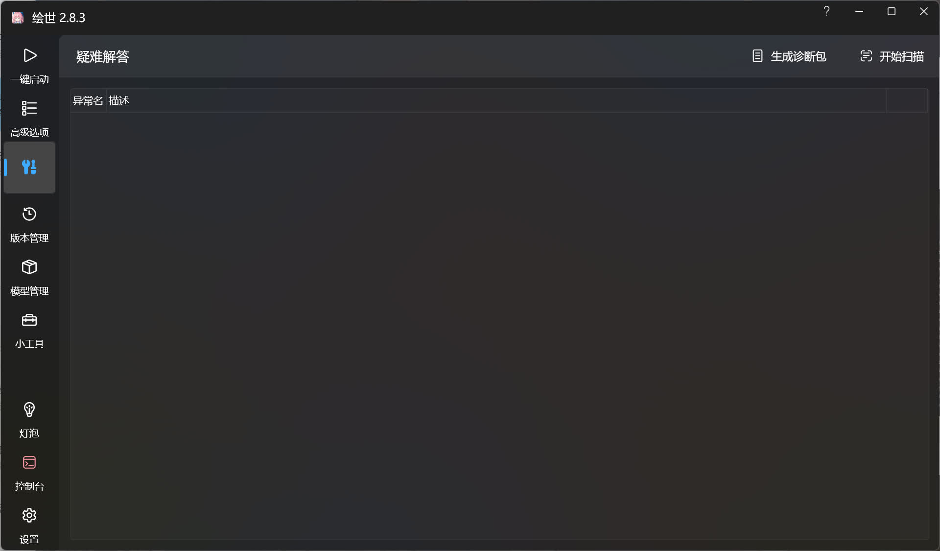 疑难解答仅能扫描出绘世启动器数据库中已注册问题已知问题,其他在控制台中出现的问题请使用浏览器搜索引擎进行搜索。